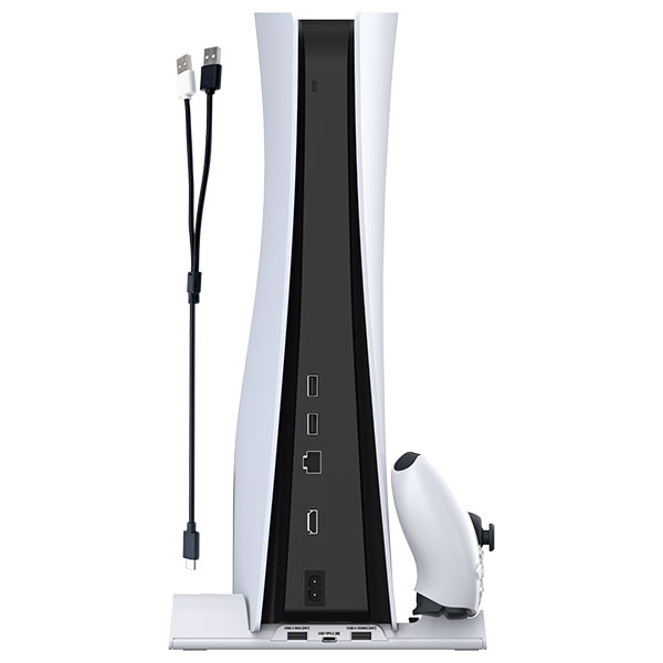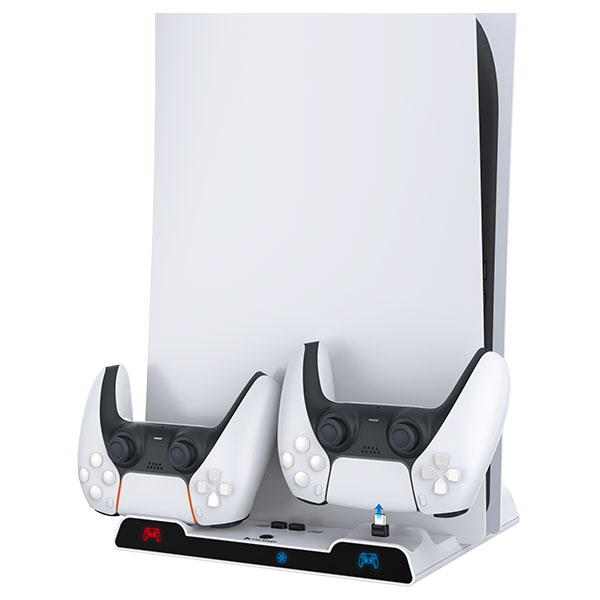 Συμβατό με PS5™ & PS5™ Digital Edition Ταυτόχρονη φόρτιση 2x DualSense™ χειριστηρίων Βάση όρθιας στήριξης με ανεμιστήρες ψύξης (με 3 ρυθμιζόμενα επίπεδα ταχύτητας). LED φωτισμός στα σημεία φόρτισης των χειριστηρίων και στους ανεμιστήρες. 2xUSB-A to 1xUSB-C καλώδιο τροφοδοσίας. Έξτρα εξόδους USB : 1x USB2.0 (Δεδομένα) + 1x USB2.0 (Φόρτιση). Θέση αποθήκευσης για εξωτερικό σκληρό δίσκο. Εύκολη εγκατάσταση και χρήση. Σημαντικό: αφαιρέστε τα προστατευτικά φιλμ στις σκούρες περιοχές του προϊόντος πριν τη χρήση. * Κονσόλα, χειριστήρια ή άλλα αξεσουάρ δεν περιλαμβάνονται.