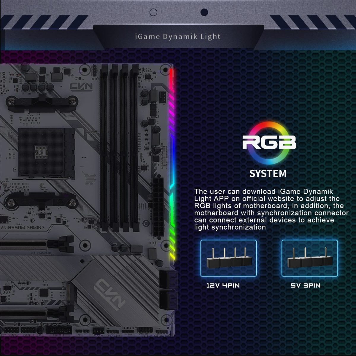 Έρχεται με λογισμικό που βοηθά στον έλεγχο των ARGB Lights, με δύο 5V 3Pin ARGB και δύο 12V 4Pin RGB. Ελέγχει τα 5V ARGB pin Lights που συνδέθηκαν στη μητρική και επιτυγχάνει συγχρονισμό με οποιοδήποτε υλικό υποστηρίζει το iGame Dynamic Light.