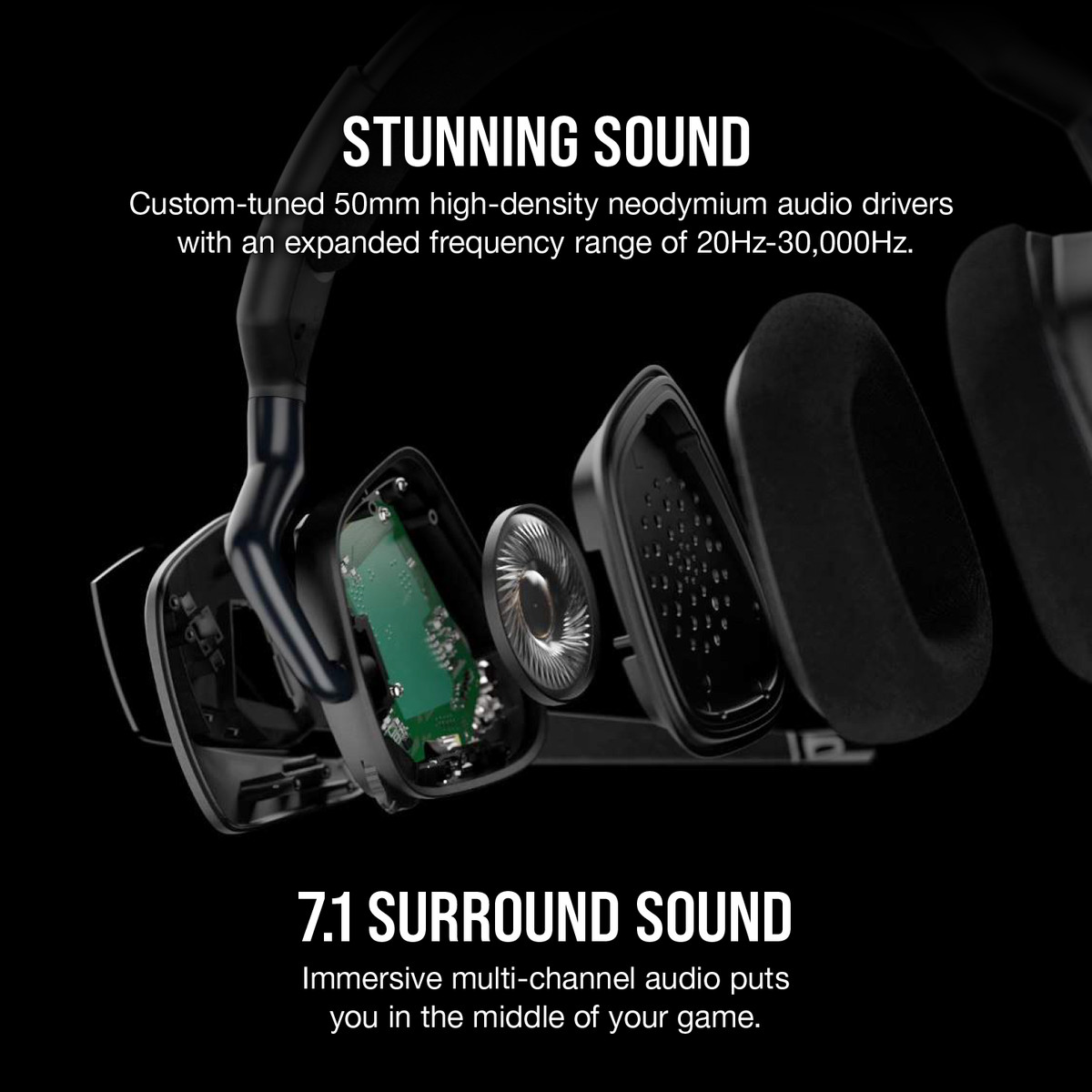 Stunning Sound Hear everything in 7.1 surround sound from the lightest footstep to the most thundering explosion thanks to premium, custom-tuned 50mm high-density neodymium audio drivers with an expanded frequency range of 20Hz-30,000Hz. Total Comfort Constructed for enduring comfort through long gaming sessions with breathable microfiber mesh fabric and plush memory foam earpads. Experience immersive 7.1 Surround Sound. Immerse yourself in 7.1 surround sound on PC, creating a multi-channel audio experience that puts you right in the middle of your game.   DURABILITY Durable Construction with Aluminum Yokes built to last through years of gaming. ON-EAR VOLUME AND MUTE CONTROLS Make on-the-fly adjustments without distracting you from your game. OPTIMIZED OMNIDIRECTIONAL MICROPHONE Picks up your voice with exceptional clarity, while a flip-up mute function and a built-in LED mute indicator ensure you know when you’ll be heard, and when you won’t. Dynamic RGB Lighting Customize your look with RGB lighting on each ear cup allowing for a near limitless array of colors and effects. PLAY YOUR WAY CORSAIR iCUE software enables precise control over your headset, with pre-tuned audio profiles, custom equalizer settings, immersive 7.1 surround sound, and sidetone control. Customize your RGB lighting on each ear cup with virtually unlimited color options and dynamic effects. Synchronize your lighting with compatible CORSAIR peripherals.   COMPATIBILITY PC with USB port, Windows 10, Windows 8, Windows 7, Internet connection (for CUE software download) Technical Specifications Headphone Frequency Response: 20Hz – 30 kHz Headphone Battery Life: N/A Headphone Sensitivity: 116dB (+/-3dB) Headphone Wireless Range: N/A Impedance: 32k Ohms @ 1 kHz Headphone Type: Wired, USB Headphone Connector: USB Headphone Drivers: 50mm Microphone Impedance: 2.0k Ohms Microphone Type: Omnidirectional Microphone Frequency Response: 100Hz to 10kHz Microphone Sensitivity: -42dB (+/-3dB) PACKAGE CONTENTS VOID ELITE RGB USB Gaming Headset Quick Start Guide Warranty Card