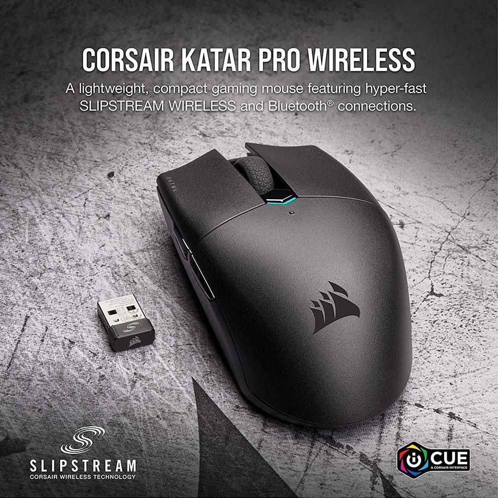 The lightweight CORSAIR KATAR PRO WIRELESS Gaming Mouse connects via hyper-fast SLIPSTREAM WIRELESS or low-latency Bluetooth. Weighing in at just 96 g, its compact symmetric shape is suitable for both claw and fingertip grip styles, while a 10,000 DPI optical sensor offers the precision you need in critical moments. Take control with CORSAIR iCUE software to program the KATAR PRO WIRELESS’ six buttons with button remaps or custom macros, adjust sensitivity, customise three DPI presets, and more. Play for up to 135 hours on a single AA battery, and bring your favourite lighting and macro profile with you anywhere with onboard storage. Take the KATAR PRO WIRELESS in hand for lightweight design and heavy-weight performance.