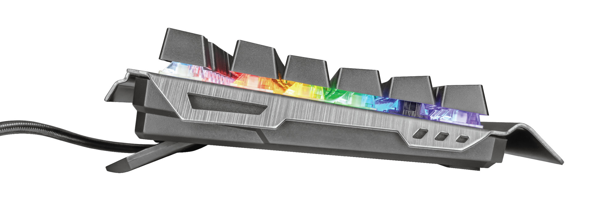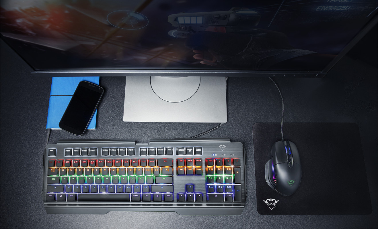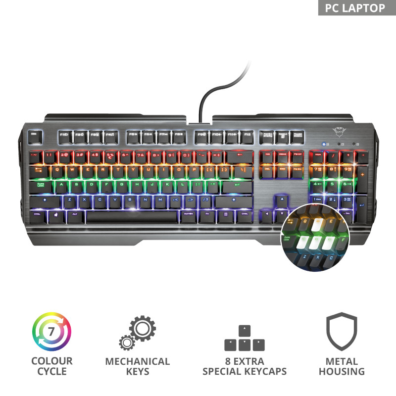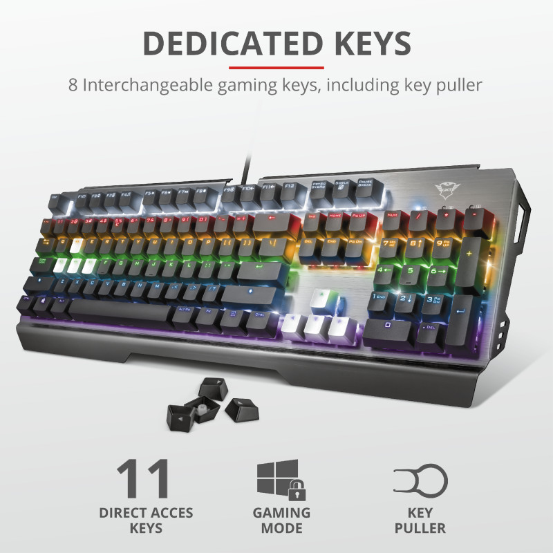 Μηχανικό πληκτρολόγιοΜηχανικό πληκτρολόγιο μεταλλικής σχεδίασης για παιχνίδια, με διακόπτες γρήγορης απόκρισης και 8 καταστάσειςχρωμάτων. Βασικά χαρακτηριστικά • Μηχανικοί γραμμικοί διακόπτες ταχείας απόκρισης, που αντέχουν έως 50 εκατομμύρια πατήματα πλήκτρων• Στιβαρή επάνω επιφάνεια κατασκευασμένη από μέταλλο• 7 καταστάσεις χρωμάτων ουράνιου τόξου με ρυθμιζόμενη φωτεινότητα• Προηγμένη λειτουργία anti-ghosting με N-key rollover• Ειδική κατάσταση λειτουργίας για παιχνίδια, που απενεργοποιεί το πλήκτρο Windows• 8 εναλλάξιμα πλήκτρα για παιχνίδια, συμπεριλαμβάνεται εργαλείο αφαίρεσης καλυμμάτων πλήκτρων Απαιτήσεις συστήματος • Επιτραπέζιος/φορητός υπολογιστής με θύρα USB• Windows 10, 8 ή 7 Περιεχόμενο συσκευασίας • Μηχανικό πληκτρολόγιο• Εγχειρίδιο χρήσης• Αυτοκόλλητο Gaming• Εργαλείο αφαίρεσης καλυμμάτων πλήκτρων• 8 πρόσθετα καλύμματα πλήκτρων για παιχνίδια