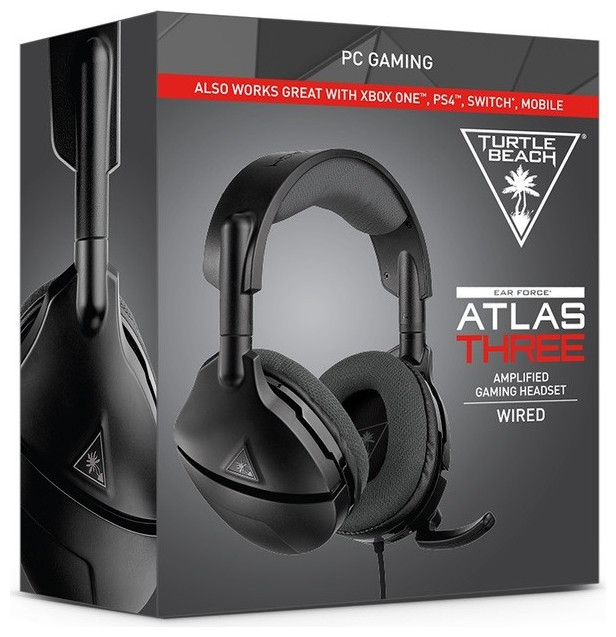 The Turtle Beach® Atlas Three PC gaming headset delivers powerful amplified Windows Sonic for Headphones surround sound for total immersion. The Atlas Three features large 50mm speakers for game audio and Turtle Beach’s renowned high-sensitivity flip-to-mute mic for crystal-clear chat. For added durability and unmatched comfort, the Atlas Three sports a metal-reinforced frame with Turtle Beach’s unique ProSpecs™ glasses friendly design, along with a breathable fabric-wrapped headband and memory foam ear cushions. Additionally, the Atlas Three offers Variable Mic Monitoring so you can hear and adjust the volume of your voice inside the headset to avoid shouting, plus three audio presets including Vocal Boost, and a rechargeable battery that delivers over 40-hours of gaming per use! Specs Audio Connection PC Gaming: 3.5mm or Pink/Green PC Splitter Cable (included) Xbox One, PS4™ Pro & PS4™, Nintendo Switch™, Mobile Devices: 3.5mm Speaker Frequency Response 20Hz – 20kHz Speaker Size 50mm with Neodymium Magnets Battery Rechargeable 900mAh Lithium Polymer Microphone Flip-Up Omni-Directional Headband Material Fabric with Foam Cushioning Ear Cushion Over-Ear, Fabric with Memory Foam Cushioning What’s in the Box Atlas Three Gaming Headset PC Splitter Cable, Micro USB Charging Cable Quick Start Guide Turtle Beach Sticker